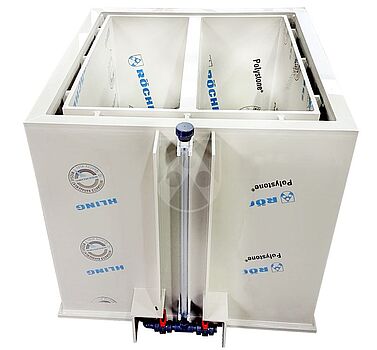 The partition wall in the double rinse tank was also manufactured from Polystone® P CubX®. This construction, without the otherwise conventional steel reinforcement, even provides advantages in the galvanisation process: During galvanisation a workpiece goes through several work stages. After each process, chemical residues, which must then be thoroughly rinsed off and removed in the basins, adhere to the workpieces. The rinsing is intended to remove the film sticking to the surface of the workpiece as a result of the previous process. When double rinsing, this cleaning process takes place in two stages. The rinsing in the first chamber removes the majority of the chemical residues. In the second chamber the intensity of the cleaning is increased with a second rinsing.