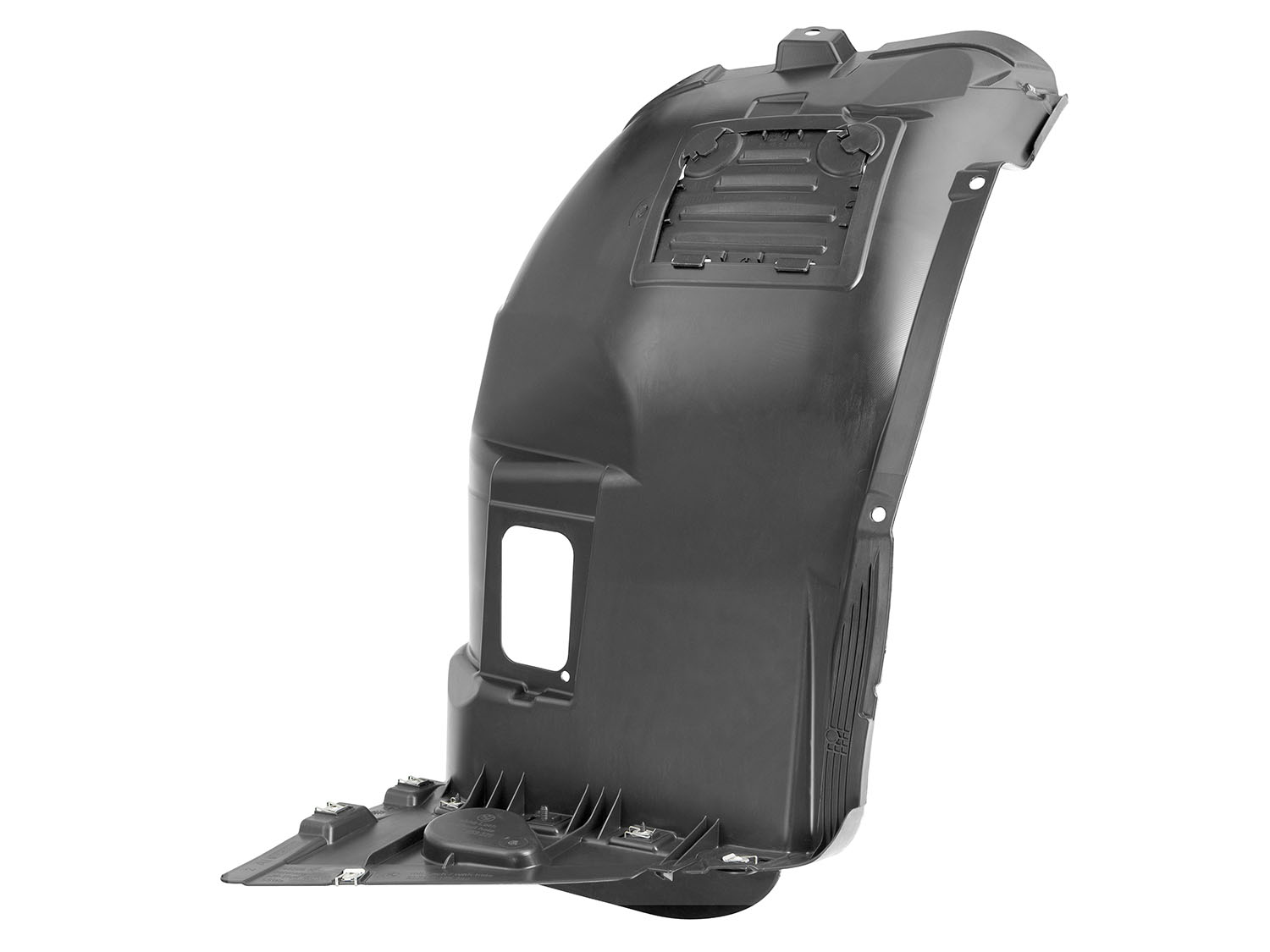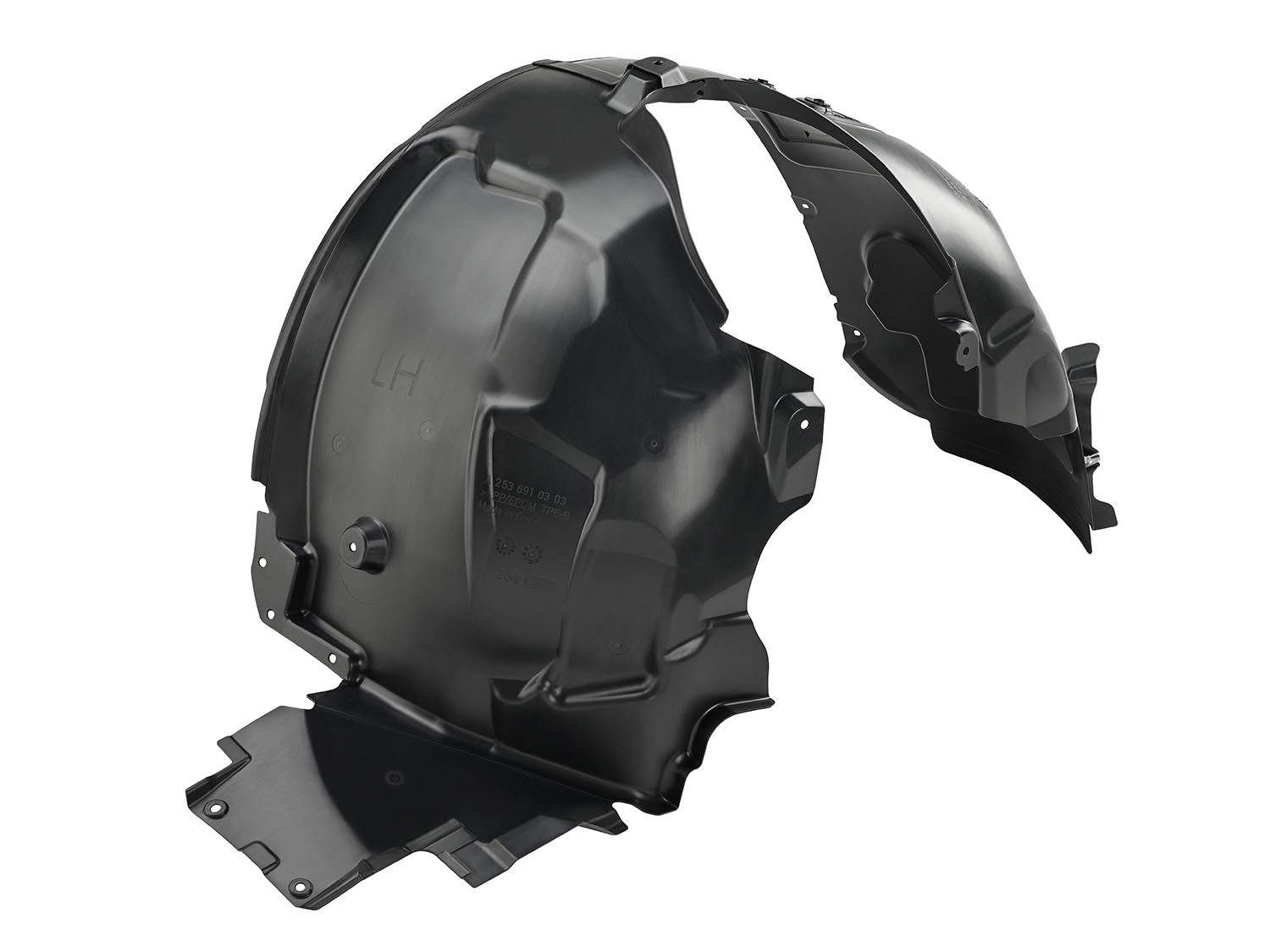 Wheel arch liners (WAL) not only protect the bodywork but also improve acoustics and aerodynamics. Hybrid WALs with nonwoven inserts are lighter, acoustically optimized, and allow easier integration of cooling openings compared to pure plastic versions. WALs act as air curtains and improve aerodynamics, especially in combination with speed lips and bumpers. Special materials further enhance noise reduction.