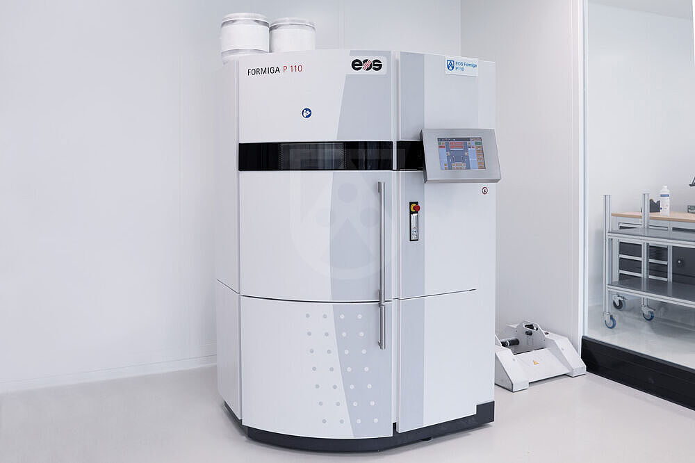 In the SLS process, the polymer powder is preheated to just below the materials melting point in the build chamber. A fine layer of powder is distributed via a roller and the printing area is subsequently scanned with a CO2 laser, allowing the particles to fuse together.