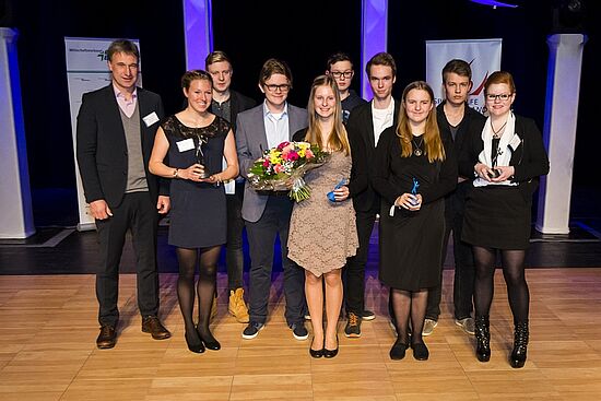 Happy winners: Sports figure Maren Kock (2.v.l.), the Chess Club Lingen as Team of the Year together with the “SportOscar” made of plastic as well as the up and coming athlete Andrea Freymuth (r.); to the left the guest of honour Marco Bode, Chairman of the Supervisory Board of Werder Bremen (Picture: Stefan Schöning, www.werbefotostudio.de)