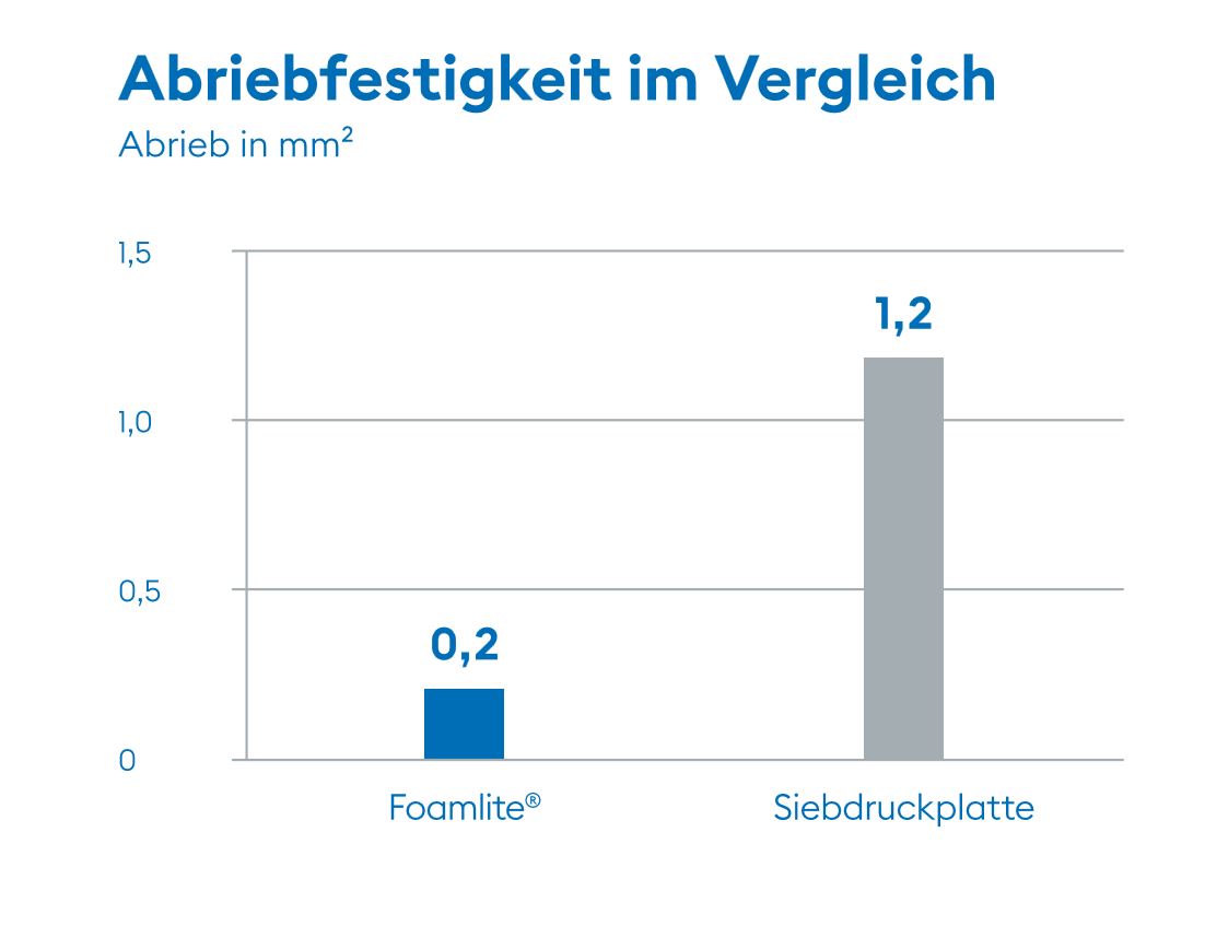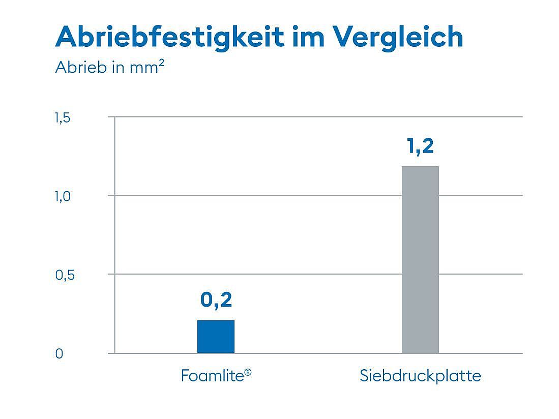 In Nutzfahrzeugen müssen Oberflächen in vielen Bereichen langfristig einer hohen mechanischen Beanspruchung standhalten. Tests in unserem unternehmenseigenen Werkstofflabor zeigen, dass Foamlite® Fahrzeugbauplatten eine deutlich höhere Abriebfestigkeit haben, als eine im Vergleich getestete herkömmliche Fahrzeugbauplatte aus Sperrholz (Siebdruckplatte).