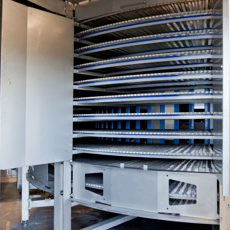 Bei der Konstruktion von Spiralfrostern verwendet ein führender Hersteller von industriellen Gefriersystemen extrudierte Röchling-Profile aus LubX®. Im Froster läuft ein Fließband, auf dem die Pizzen transportiert werden, spiralförmig nach oben. Als Gleitschienen für das Fließband sorgen die Profile für einen ausgezeichneten Förderprozess. Dank der hervorragenden Gleiteigenschaften reduziert LubX® die benötigte Förderkraft und so die eingesetzte Energie. Mit einer Dauereinsatztemperatur von minus 150 Grad bis plus 80 Grad Celsius, ist die dauerhafte Anwendung von LubX® auch in frostiger Umgebung möglich. Zudem ist der Werkstoff gemäß der neuen EU Richtlinie 10/2011/EU und der amerikanischen FDA für den Kontakt mit Lebensmitteln geeignet.