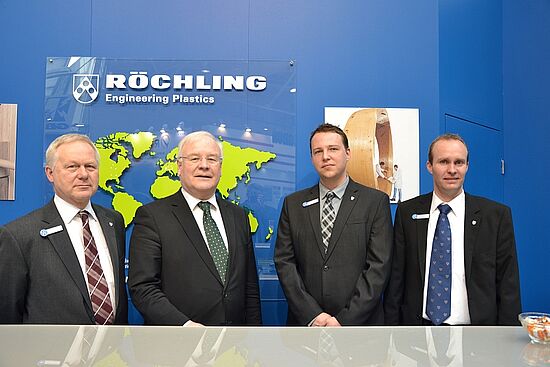 Prominenter Emsländer zu Besuch auf der Hannover Messe: Niedersachsens Landtagspräsident Bernd Busemann (CDU) (2. v.l.) auf dem Messestand von Röchling Engineering Plastics mit Joachim Gorzitze, Jörg Leugers und Manfred Schütte