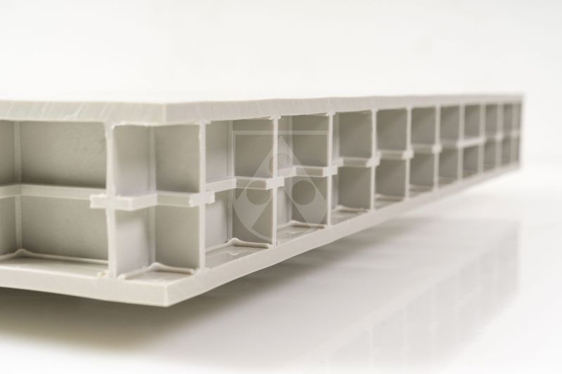 Die Reinhard Krüger Kunststoffbau GmbH hat sich deswegen dafür entschieden, Auffangwannen für Doppelspülen in der Galvanikindustrie aus der von Röchling neu entwickelten Hohlkammerplatte Polystone® P CubX® zu fertigen. Für Auffangwannen mit einer Höhe von bis zu 1000 mm ermöglicht Polystone® P CubX® eine Konstruktion vollständig ohne Stahlverstärkungen. So entfällt das aufwändige Verschweißen von Verstärkungsprofilen.
