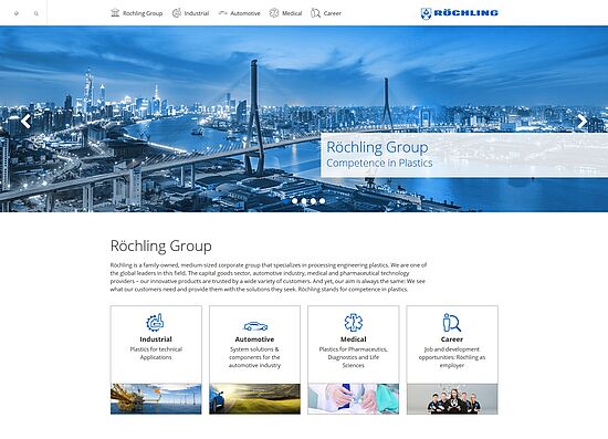 Die Röchling-Gruppe präsentiert auf www.roechling.com das vollständige Angebot an Kunststoffprodukten und Dienstleistungen des weltweit führenden Kunststoffspezialisten. Das neue Design berücksichtigt auch die Anforderungen mobiler Geräte. Das Responsive Design passt die Darstellung der Inhalte automatisch an die Größe des jeweiligen Displays an.
