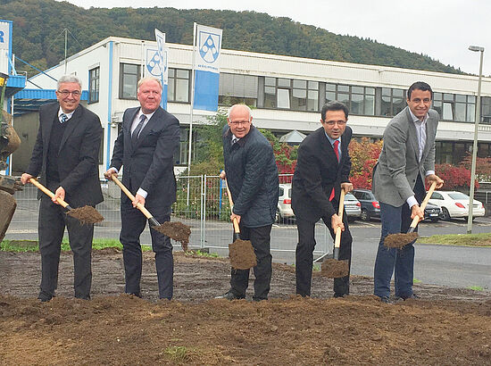 Lahnstein, 16.Oktober 2015 – Die Röchling Sustaplast SE & Co. KG erweitert am Standort in Lahnstein ihr Logistikcenter. Die bestehende 3.100 Quadratmeter große Halle wird um einen 900 Quadratmeter großen Versandbereich sowie um 3.000 Quadratmeter Hallenfläche erweitert und somit mehr als verdoppelt. Im Beisein von Roger Lewentz, Staatsminister im Ministerium des Innern, für Sport und Infrastruktur, des Landes Rheinland-Pfalz, und Peter Labonte, Oberbürgermeister Lahnstein, erfolgte am Freitag der erste Spatenstich. Mit dieser millionenschweren Investition stärkt Röchling den Standort Lahnstein und baut die Position als führender Verarbeiter von technischen Kunststoffen im weltweiten Markt weiter aus.