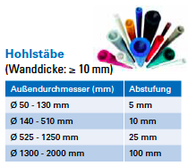 Im Bereich Hohlstäbe aus SUSTAMID 6G haben wir unser umfangreiches Lagerprogramm noch erweitert. Sie haben nun die Möglichkeit, aus einem Sortiment von mehr als 60 verschiedenen Abmessungsvarianten in den Außendurchmessern von 50 mm bis hin zu 300 mm zu wählen.