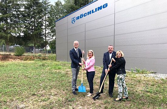 New production halls will be built here by 2021: Dietmar Telgenkämper, Business Unit Director Production and Engineering at Röchling Industrial, Dr. Susanne Ganster, District Administrator of South-West Palatinate, Gerold Fatscher, Managing Director of Röchling Hydroma GmbH and Miriam Heinrich, Managing Director of BPA South-West Palatinate, at the ground-breaking ceremony