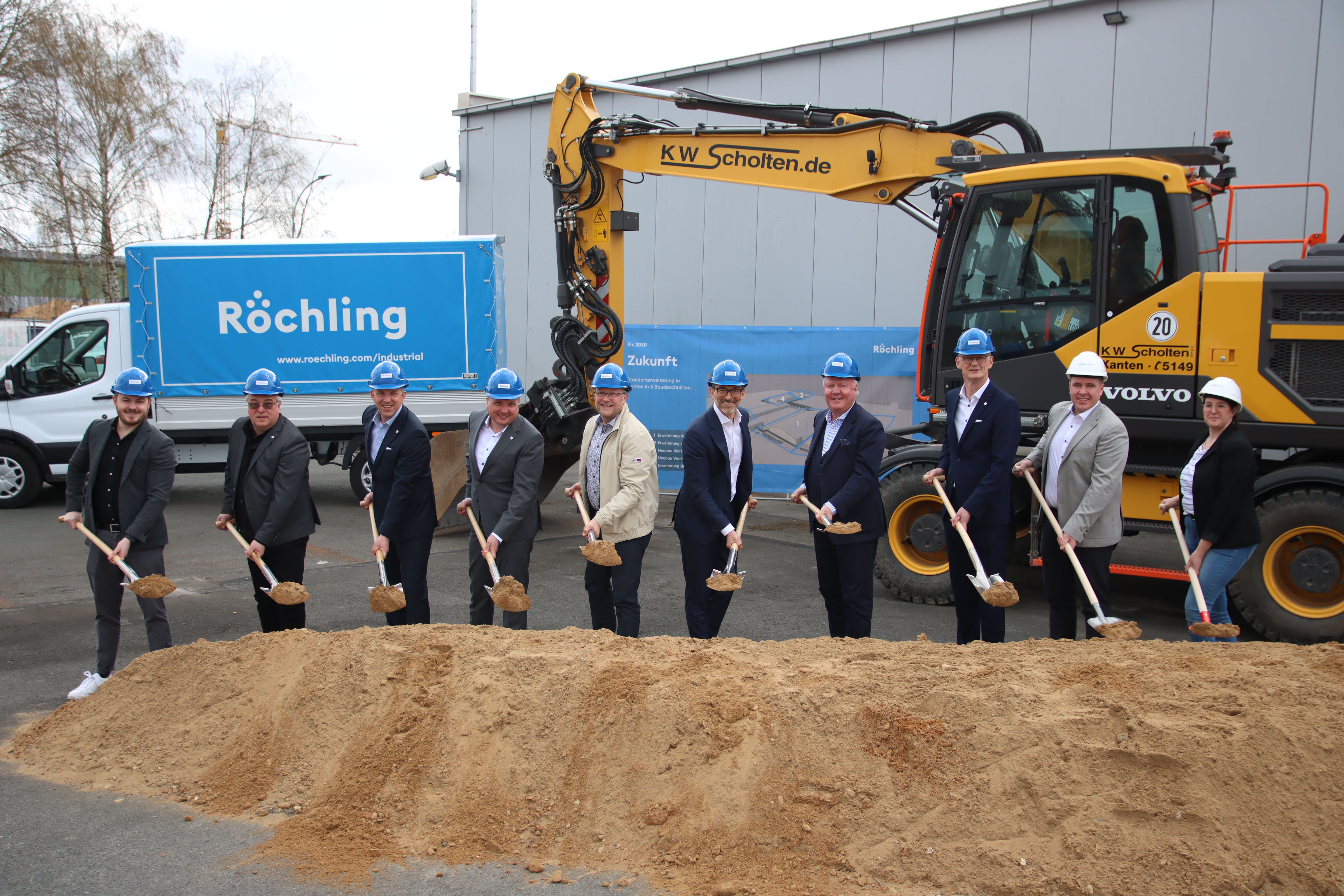 First groundbreaking at Röchling in Xanten (from left to right): Thilo Schwedmann (Economic Promoter of the City of Xanten), Roger Klein (Head of Management Systems/Director of Operations), Thomas Schlag and Ralf van Holt (both Managing Directors of Röchling Industrial Xanten), Thomas Görtz (Mayor of the City of Xanten), Raphael Wolfram (Spokesman of the Executive Board of the Röchling Group), Franz Lübbers (CEO Röchling Industrial and Member of the Executive Board of the Röchling Group), Dietmar Telgenkämper (Global Technical Director Machined Components), Marco Thieben (Architectural Office Schomaker & Henschel) and Kathrin Niehoff (Architectural Office Schomaker & Henschel)