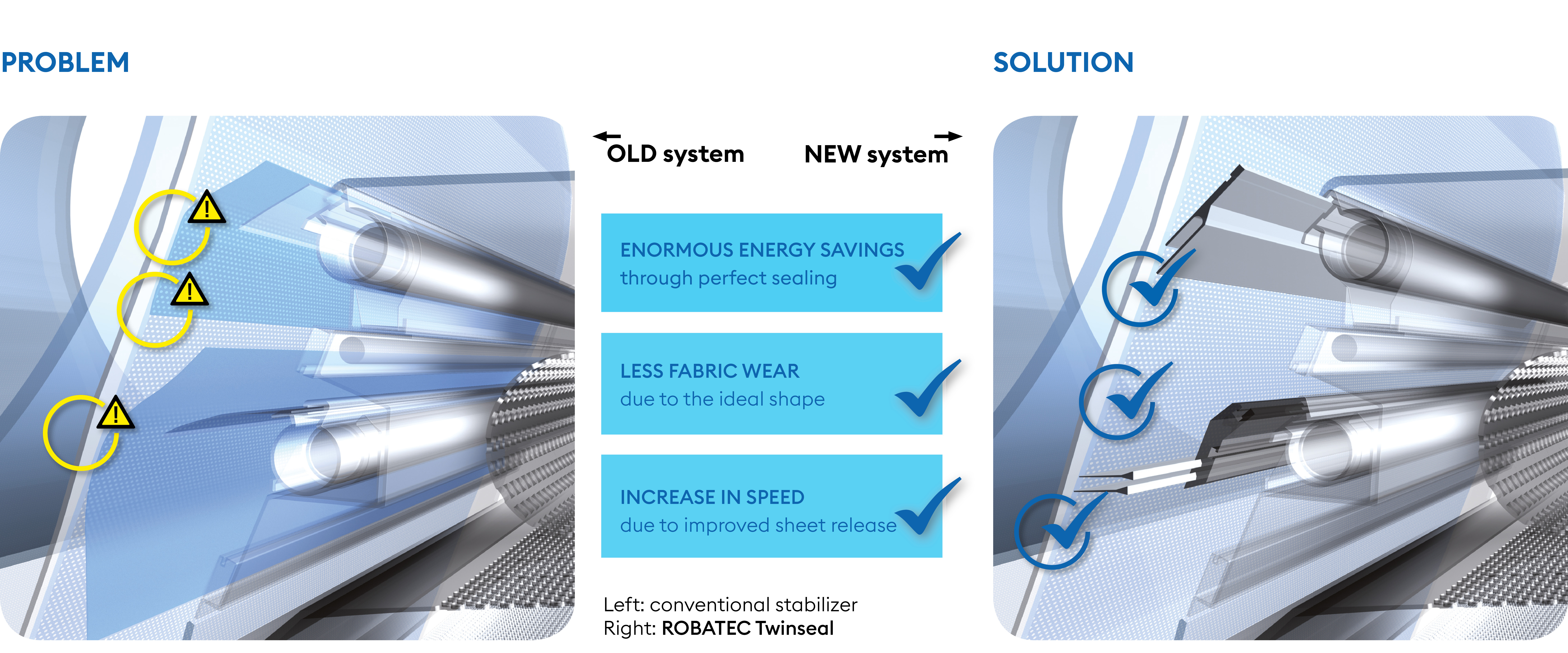 Multiple sealing / stabilizers in the dry section for optimized web guidance in the particularly sensitive area of the first dry section in the paper machine.