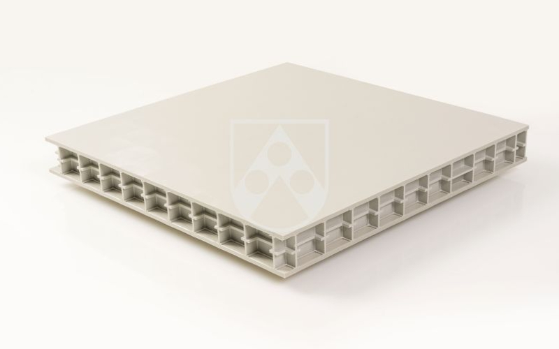 The special feature is the sheet design, which combines very high longitudinal and transverse stiffness in the sheet itself. Polystone® CubX® consists internally of a homogeneous, rectangular (orthogonal) grid pattern, welded to two sheets on its outsides, which form the sheet surface. The result is an innovative construction sheet that combines light weight and ease of handling with very high longitudinal and transverse rigidity.