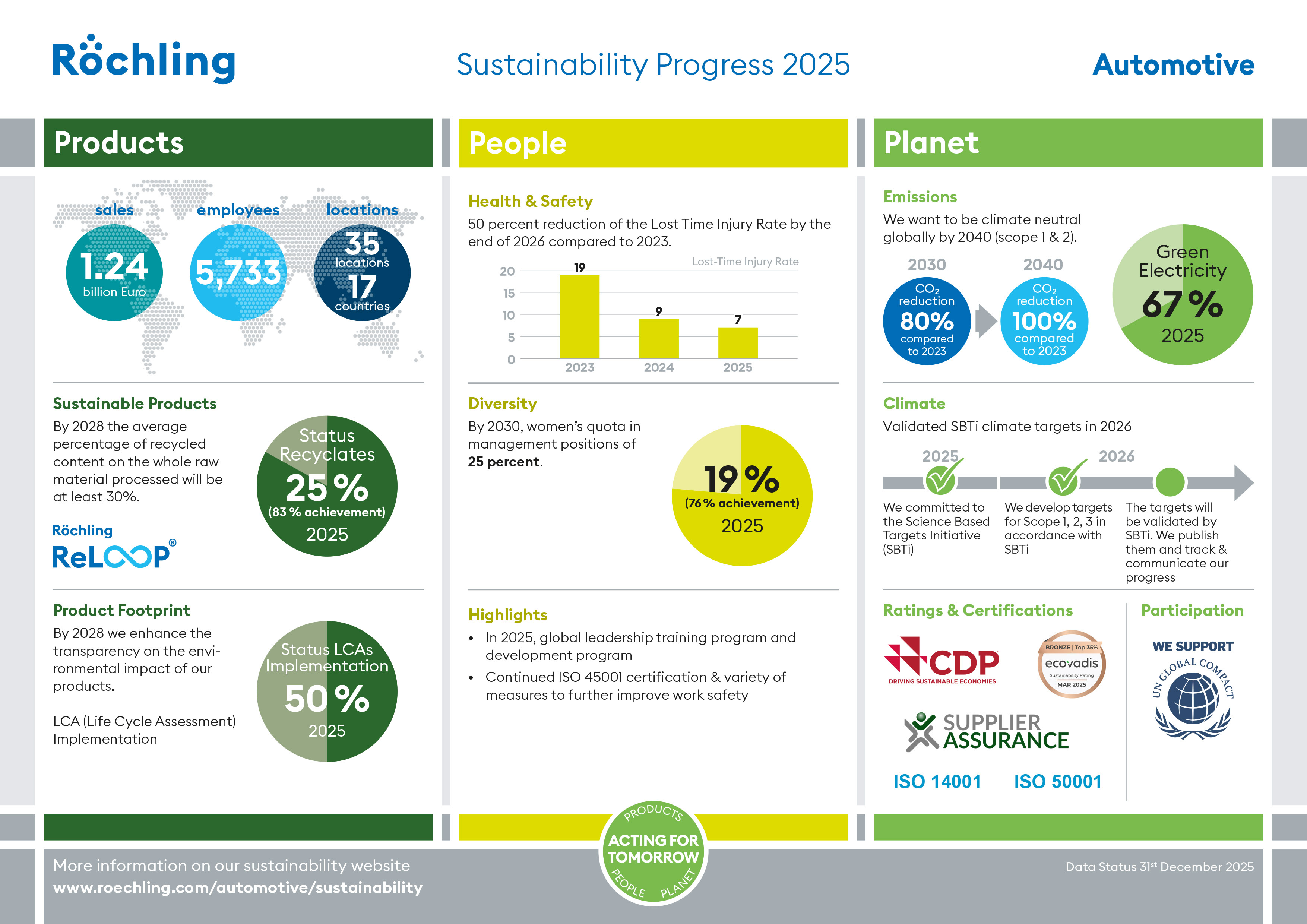 我々は、強度と耐熱性に優れたエンジニアリングプラスチックの専門家として、持続可能性は環境保全と資源循環のために重要であると認識しています。2022年に、ロシュリング持続可能性評議会を設立しました。そこでは持続可能性に関連する問題に特化し、取締役会に対して具体的な対策の導入を促しています。