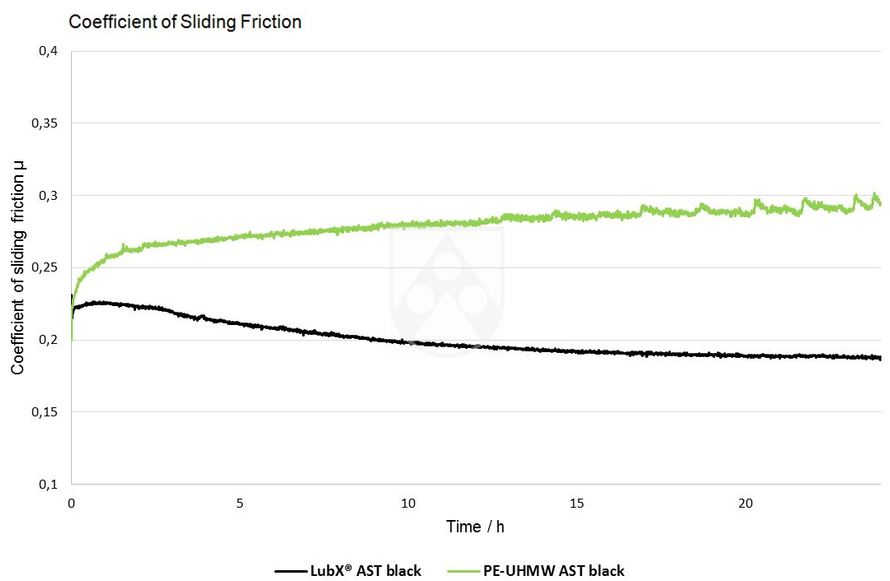 기계 건설에 사용되는 표준 정전기 방지 소재와 비교하여 LubX® AST 블랙의 슬라이딩 마찰 계수 μ는 0.19로써, 30% 이상 우수한 슬라이딩 특성을 제공합니다. 슬라이딩 마찰 계수(건마찰). 실제 응용 분야에서 사용되는 일반적인 조건에서 Röchling 트라이볼로지 장비를 통해 검증되었습니다. 속도: 0.5m/s, 표면 압력: 0.5MPa, 테스트 기간: 24시간