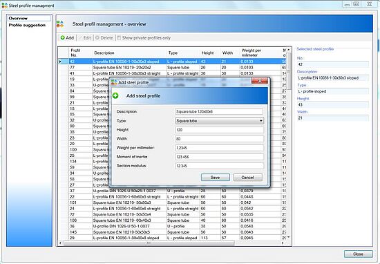 New function: Users can use the new steel profile management tool to store individual profiles in the system and incorporate them into the calculation