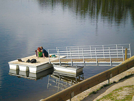 The company's second source of income is pontoon construction. Floating pontoons are used as piers in marinas, as ferry terminals or as fishing stages. The pontoons that James Boat produces in a host of different sizes and designs comprise several floating bodies made of plastic. They have a walkable surface that can be covered with wood, for example. The pontoons can be simply set up anywhere and should relocation to another landing stage be necessary, all that is needed is a towboat for transport.