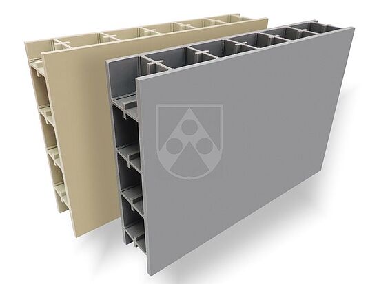 Polystone® PPs CubX® and Polystone® P CubX®: Polystone® PPs CubX® (in front) is available in a user-friendly 2,000 x 1,500 mm format, with a thickness of 57 mm, in the colour grey (RAL 7037); by comparison, Polystone® P CubX® (behind) is available in the colour grey (RAL 7032)