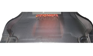 For exhaust system covers and side engine-insulations, Röchling Automotive has already combined LWRT materials with aluminum. From there, though, it was still a huge leap to the newly developed, weight-optimized, and acoustically-effective solution with thin perforated aluminum film on both sides. The right combination of materials was first established when doing detail work on parameters like  process capacity, low weight per unit area, good heat dissipation, and high heat reflection.