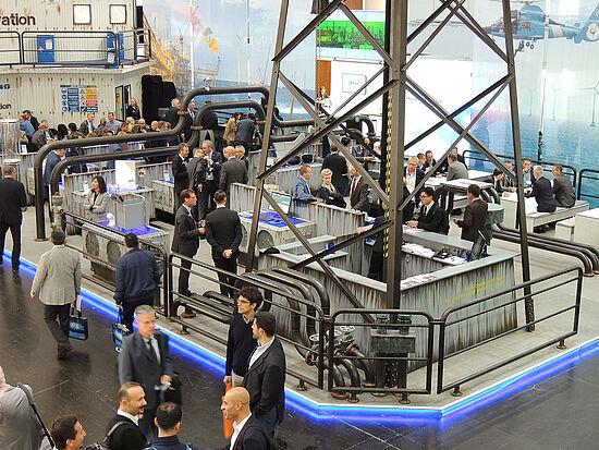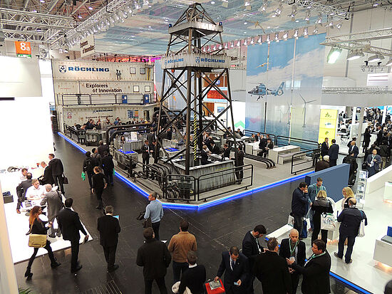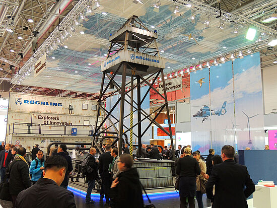 Röchling presented his application oriented plastic exhibits on an extraordinary stand, which stood out from the other stands thanks to its authentic design. Under the motto "Explorers of Innovation" the Röchling stand had the look of an oil rig. With a drilling tower, high superstructures and a view of the sea, as well as lots of loving details like seagulls, warning signs, a helicopter landing field, as well as the sound waves and gull screams, the booth gave the visitors the feeling of being on the high seas.